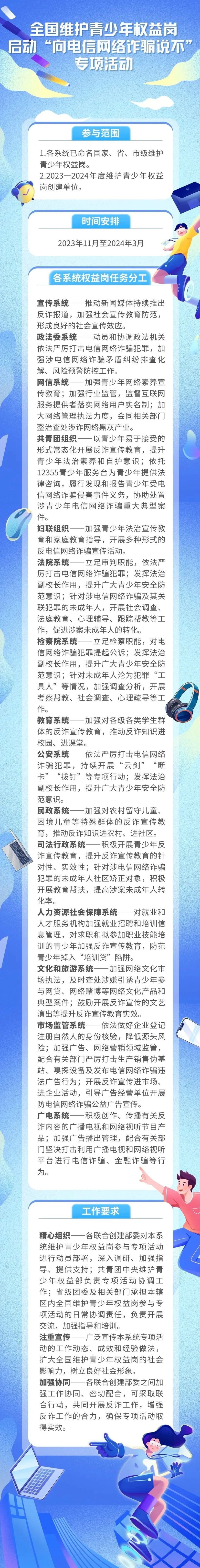 为深入贯彻习近平总书记关于打击治理电信网络诈骗犯罪工作的重要指示精神和中央有关要求,切实维护青少年合法权益,近日,共青团中央、中央宣传部、中央政法委、中央网信办、全国妇联、最高人民法院、最高人民检察院、教育部、公安部、民政部、司法部、人力资源社会保障部、文化和旅游部、国家市场监督管理总局、国家广播电视总局等15部门联合印发《关于开展“权益岗在行动:向电信网络诈骗说不”专项活动的通知》。