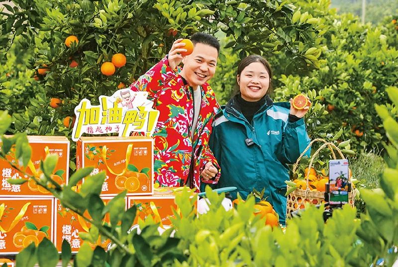以互联网为核心的信息技术发展催生了农村电商、乡村旅游等一批新业态,为推进农业绿色发展开辟了新赛道。图为2024年1月19日,重庆市垫江县五洞镇龙滩村柑橘基地,直播团队在进行直播带货。 人民图片 龚长浩/摄