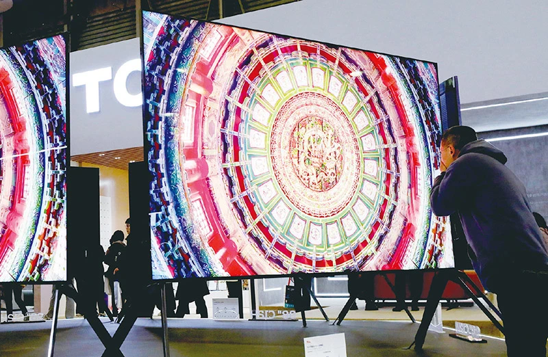 3月14日,2024年中国家电及消费电子博览会在上海新国际博览中心开幕。全球家电及消费电子领域顶流品牌在博览会上齐聚一堂,集中展示各自最新的创新成果。图为一名参观者在一家公司展台上观察一款电视展品的屏幕。 新华社记者 方喆/摄