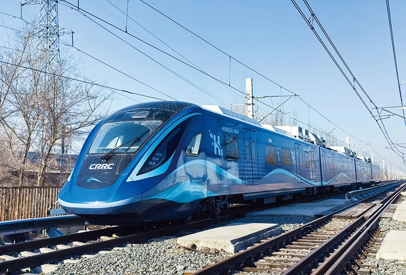 图为2024年3月21日,我国首列氢能源市域列车在位于长春的中车长客试验线进行运行试验,标志着氢能在轨道交通领域应用取得新突破。 新华社发 中车长客股份公司供图