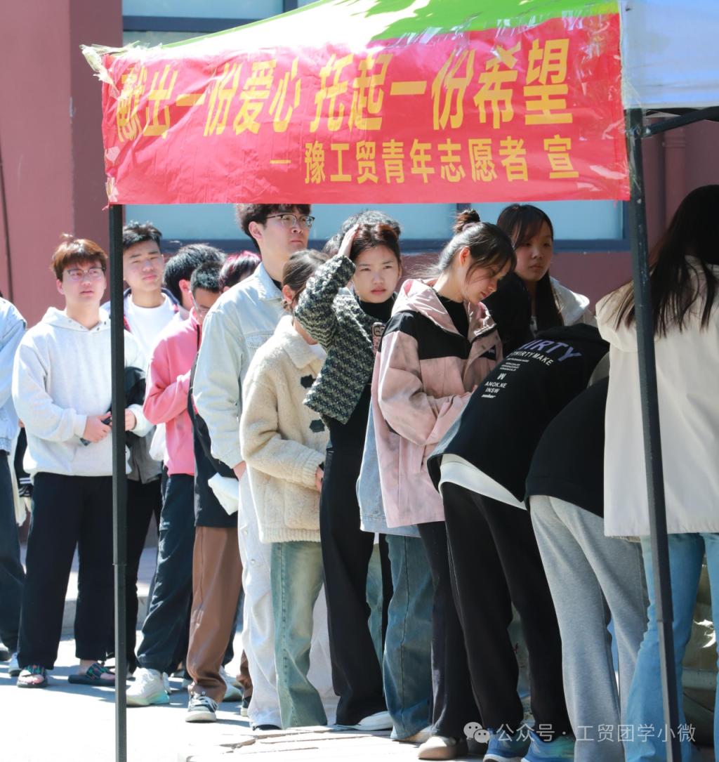 活动现场布置简洁温馨,红色横幅上“献出一份爱心,托起一份希望”的标语格外醒目,志愿者们身着统一服装,在校园里热情引导师生参与活动。