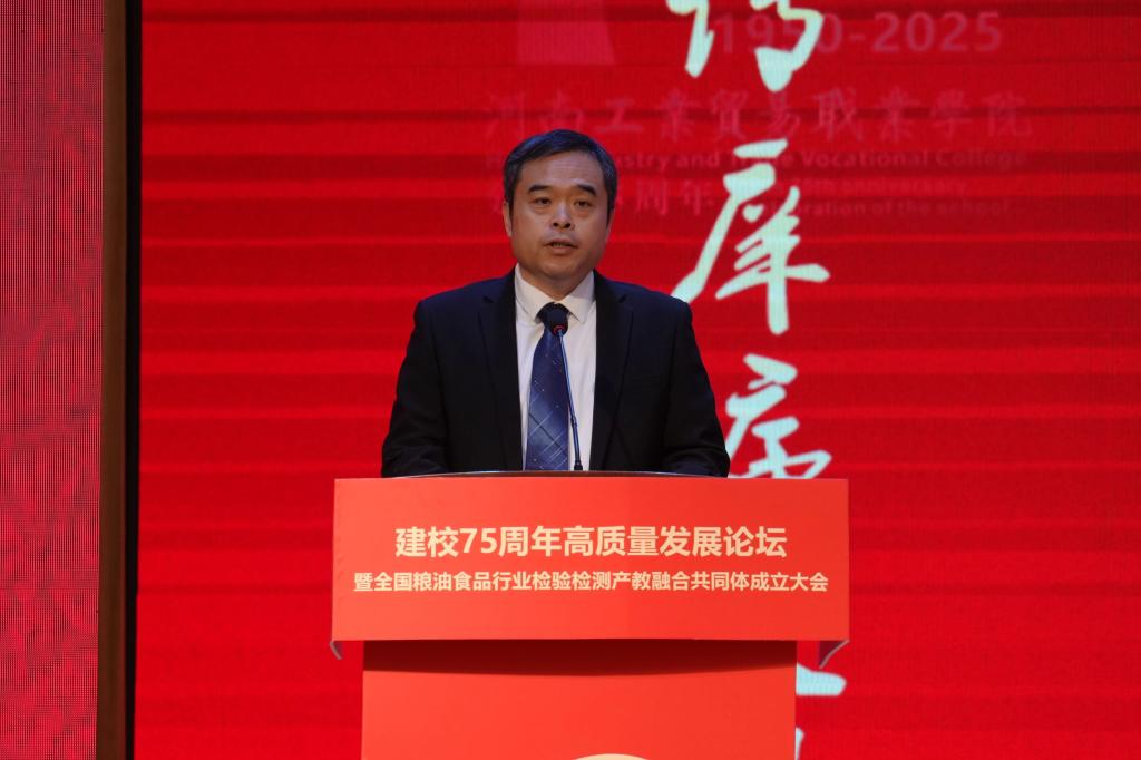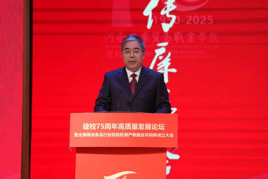 张国强代表河南省教育厅对学校建校75周年及全国粮油食品行业检验检测产教融合共同体成立致以诚挚祝贺。他表示,共同体是落实党中央部署、服务产业转型、守护粮食安全的关键举措,学校要始终坚持育人为本、强化协同创新、深化体制机制建设,以共同体为纽带推动食品产业高质量发展,为构建“教育链、人才链、产业链、创新链”深度融合的新生态注入强劲动力。