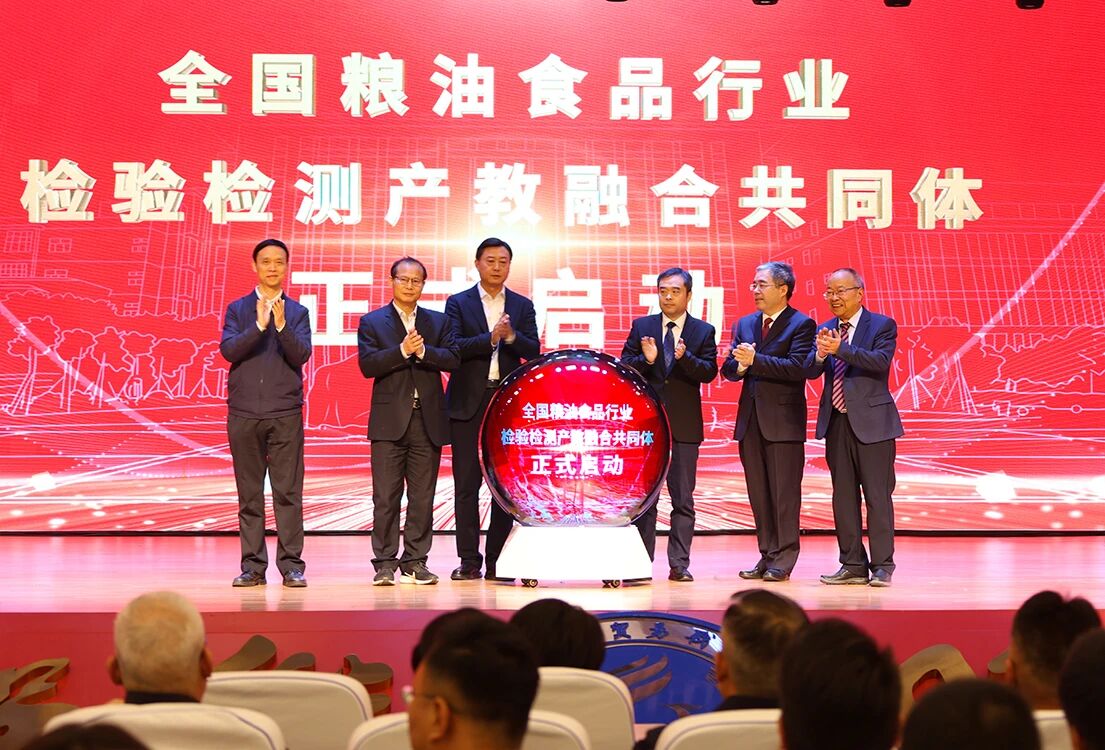 在全体嘉宾的见证下,张国强、陈晓鹏、黄泽峰、黄德珠、李国锋、曹利强共同按下启动键,标志着全国粮油食品行业检验检测产教融合共同体正式成立。