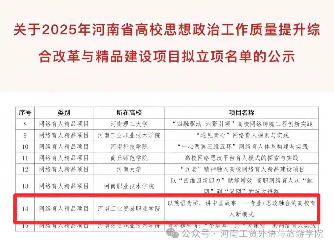 近日,中共河南省委教育工委、河南省教育厅发布了《关于2025年河南省高校思想政治工作质量提升综合改革与精品建设项目拟立项名单的公示》。我院申报的《以英语为桥,讲中国故事——专业+思政融合的高效育人新模式》项目,成功入选“网络育人精品项目” 拟立项名单。