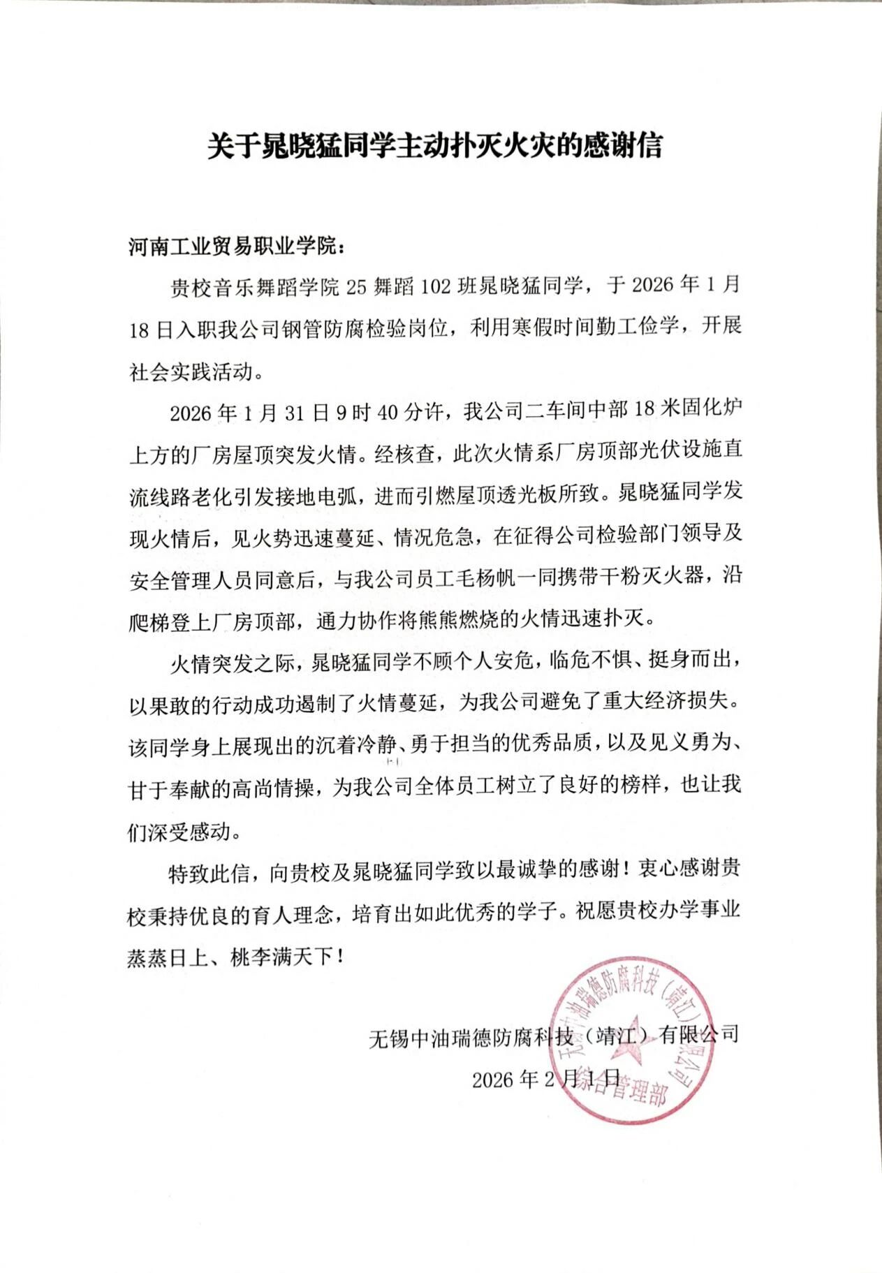 面对突发险情,临危不惧、挺身而出,不顾个人安危开展救火行动的行为,得到了企业的高度认可与赞誉。2月1日,无锡中油瑞德防腐科技(靖江)有限公司特向我校发来感谢信,对晁晓猛同学的英勇举动致以诚挚感谢,同时高度肯定我校的育人工作,感谢我校培养出兼具责任担当与果敢勇气的优秀学子。