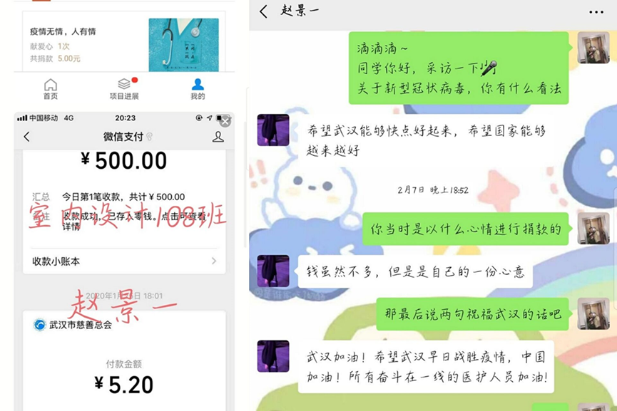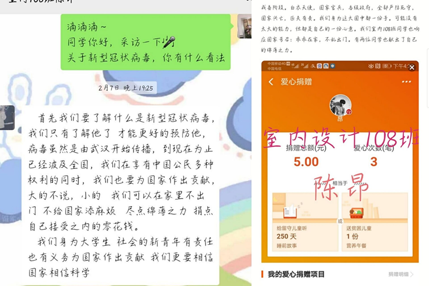我院艺术设计系系19级室内108班赵景一、陈昂两名同学分别在支付宝微信爱心捐助平台进行捐款。数目虽不多但是能充分看出面对疫情我工贸学子的爱心和责任。