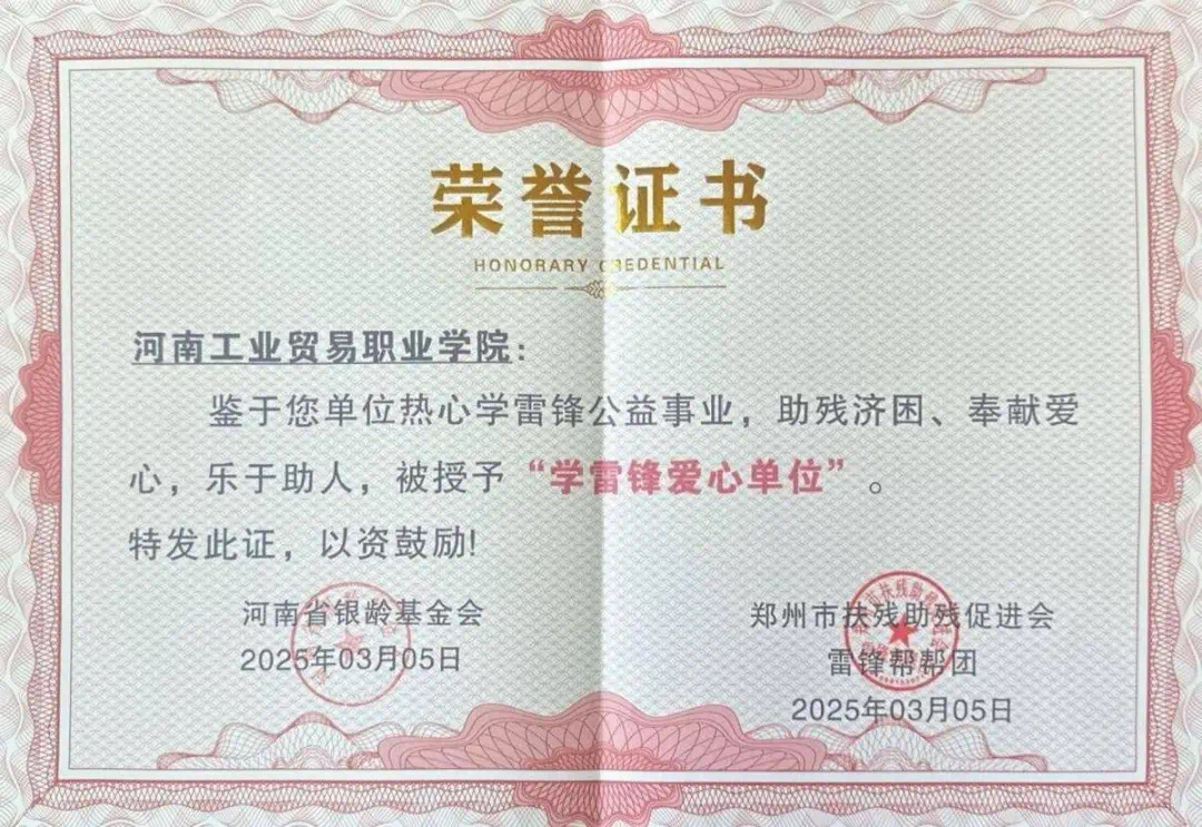 此次活动中,财务会计学院“会爱先锋”志愿者服务团被河南省银龄基金会、郑州市扶残助残促进会、雷锋帮帮团授予 “学雷锋爱心单位” 荣誉称号。志愿者们用实际行动践行了雷锋精神,展现了当代大学生的责任与担当,让雷锋精神在新时代焕发新光彩。