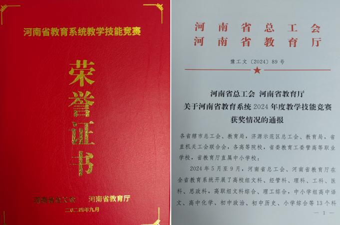 11月4日,喜讯传来,由河南省总工会、河南省教育厅在全省教育系统开展的2024年度教学技能竞赛结果揭晓,我校参赛的两位教师凭借稳固的专业技能、革新的教学方案和具备感染力的课堂表现获得了评审专家的一致认可。机电工程学院张立老师获得高职理工综合二等奖,艺术设计学院蔡怡菲老师获得高职文科综合二等奖。