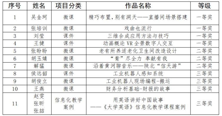 本次大赛自5月份启动以来,学校党委高度重视,教务处认真筹备、精心组织、积极动员,各二级学院踊跃参加,共申报参赛项目32个,经专家评审择优推荐15项参加比赛。比赛中,参赛选手精心设计教学方案,巧妙运用多媒体教学手段,将复杂的知识以生动有趣的方式呈现出来。最终,我校教师在微课类项目中获得2个一等奖、3个二等奖、2个三等奖,在课件类项目中获得2个一等奖、1个三等奖,在信息化教学案例类项目中获得1个三等奖。