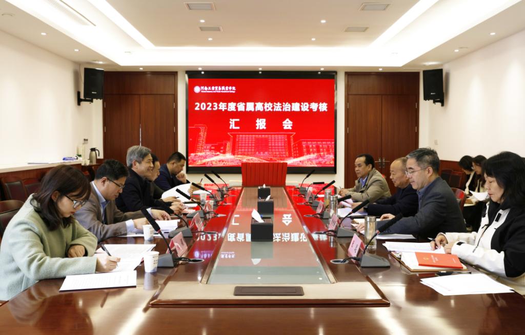 根据省委教育工委、省教育厅统一安排,3月27日下午,省属高校法治建设第一考核组一行5人在考核组组长、郑州升达经贸管理学院党委书记雷霆带领下,来校实地考核2023年度法治建设工作。校党委书记李国锋作2023年度述法报告,校长曹利强主持汇报会,党委副书记、工会主席王修法,党委委员、纪委书记张远及相关部门负责人参加汇报会。