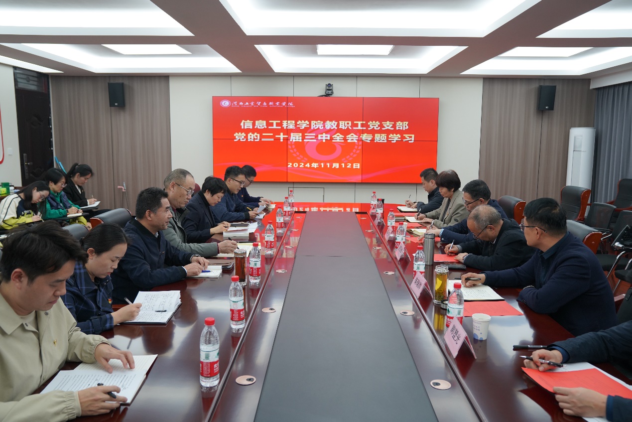 会议开始,由信息工程学院教职工党支部书记郭小娟同志领学第一议题《中共中央关于进一步全面深化改革推进中国式现代化的决定之四—构建支持全面创新体制机制》,随后参会人员集体观看《中共中央新闻发布会:介绍和解读党的二十届三中全会精神》视频,并对党的二十届三中全会精神进行集体学习。会上各参会人员和支部党员对党的二十届三中全会精神学习进行讨论,支部党员李正君、徐战威、耿宇三位同志分别结合自身工作实际依次发言,表达了自己的学习体会。最后信息工程学院党总支副书记、院长李海华同志对本次教职工党支部开展的集体学习活动进行总结发言。