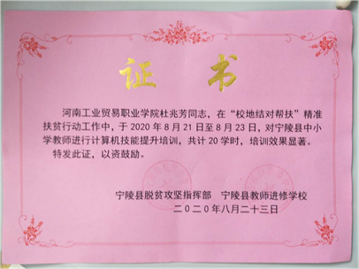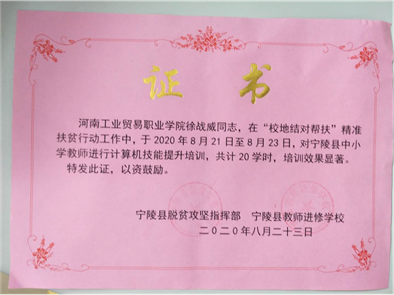 2018年11月制定了“信息工程系与宁陵县结对帮扶精准扶贫行动工作方案”,2019年先后派黄腾飞等老师到宁陵县授课。