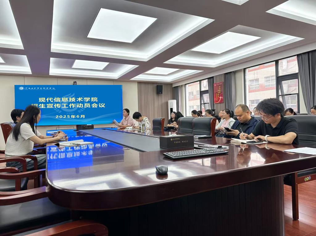 为深入贯彻落实学校招生宣传工作部署要求,充分发挥现代信息技术学院专业特色与优势,确保高质量完成2025年招生任务,6月25日上午9时,我院在优胜校区9号楼3楼会议室隆重召开"2025年招生宣传工作动员会议"。现代信息技术学院院长郭小娟、党总支副书记冯斌、副院长汪垚、副院长代一平及全院教师参加了本次会议。
