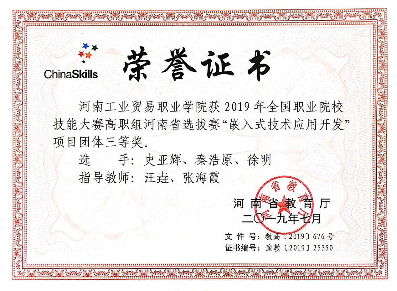 获高职组河南省选拔赛“嵌入式技术应用开发”项目团体三等奖