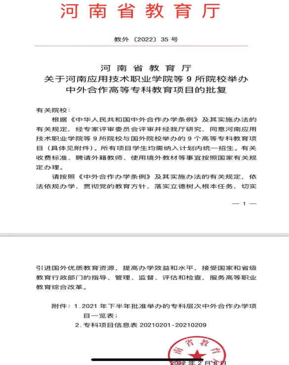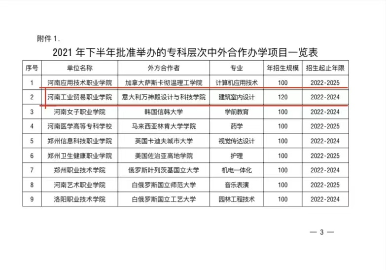 2022年2月经河南省教育厅批准,我校与意大利罗马万神殿设计与科技学院共同举办建筑室内设计的中外合作办学项目。