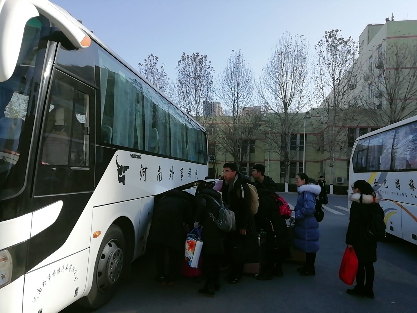 1月16日—1月17日,在红旗广场,我院组织班车送离校返家的学生前往火车站西广场、汽车南站、客运总站等三个站点,为同学们平凡返乡保驾护航。