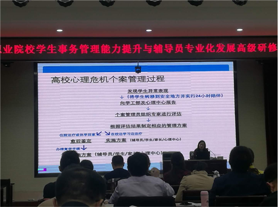三、4月27、28日,由学生工作部组织参加了在河南检察职业学院举行的《职业院校学生事务管理能力提升与辅导员专业化发展》培训。本次培训主讲人为陈兰教授和高霞教授。陈兰教授是全国高校辅导员年度人物、重庆大学建筑城规学院党委副书记。主讲内容为辅导员专业化、职业化趋势、提升辅导员自我价值,实现思想政治教育的使命担当、新时代高素质辅导员的职业工作方法。高霞教授是职业院校典范--淄博职业学院党委委员,主管学生工作,主讲内容为以学生为中心做好学生管理工作----优秀院校学生管理工作案例。