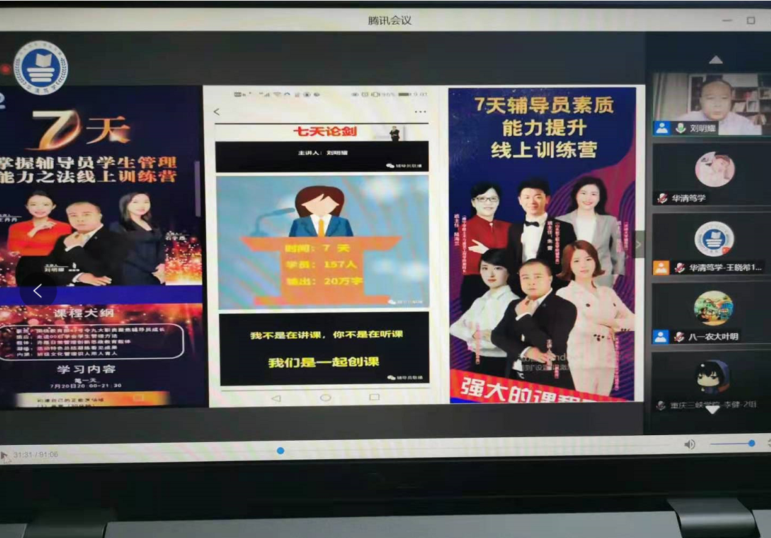 为深入贯彻落实《普通高等学校辅导员队伍建设规定》(教育部令第43号),进一步提高辅导员素质能力,推动辅导员队伍专业化、职业化建设,促进辅导员做好疫情防控背景下的学生管理工作,在党委委员、副校长刘卫红精心指导与安排下,2021年1月15日—1月21日,我校学生处组织开展了7天训练营辅导员线上培训,全校学管战线166名专兼职辅导员参加。本次培训由北京华清笃学教育科技研究院承办,通过腾讯直播平台和小鹅通平台进行。