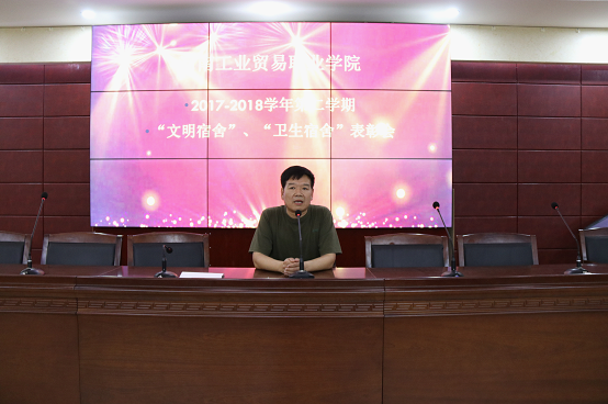 会上,李松奇副处长宣读表彰文件,并公布10个文明宿舍、10个卫生宿舍获奖单位名单。在激越昂扬的音乐声中,与会领导为获奖单位现场颁发了流动红旗和奖品。随后,穆永恩处长发表讲话,他本次文明宿舍、卫生宿舍创建工作给予充分肯定,鼓励大家再接再厉,保持成绩,号召全院学生学习先进,争创文明,并对财务会计系、应用外语系、粮食工程系等在此次活动中表现突出的单位提出表扬。