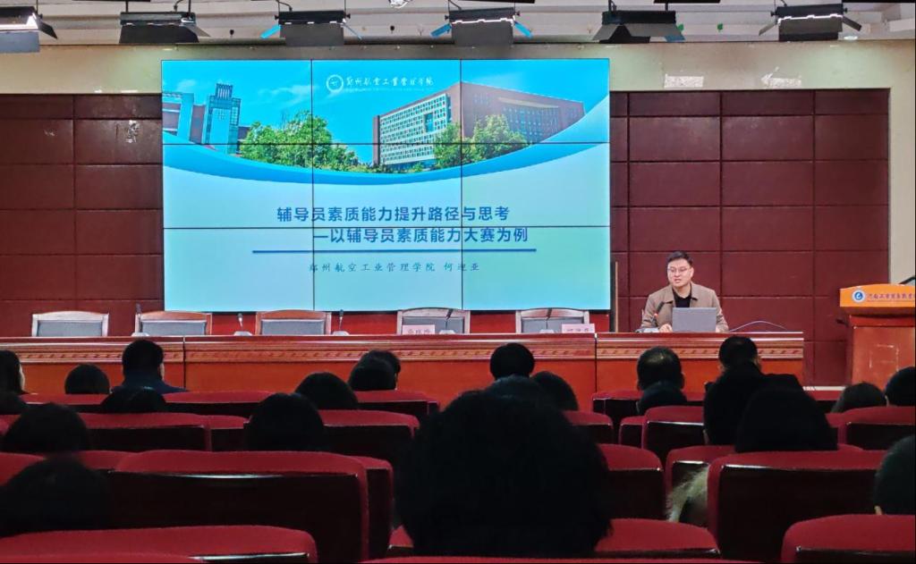 为深入学习习近平新时代中国特色社会主义思想和党的二十大精神,认真贯彻落实习近平总书记关于教育的重要论述,进一步加强学校辅导员队伍建设,提升辅导员素质能力,2023年11月13日,我校在龙湖校区3101报告厅举办辅导员素质能力提升培训,邀请河南省高校辅导员年度人物、河南省高校辅导员素质能力大赛特等奖获得者、郑州航空工业管理学院蓝天书院办公室主任何迎亚作专题报告。党委副书记柴瑞帅,各二级学院党总支副书记、团总支书记,全校专兼职辅导员,学生处全体老师参加。报告由柴瑞帅主持。