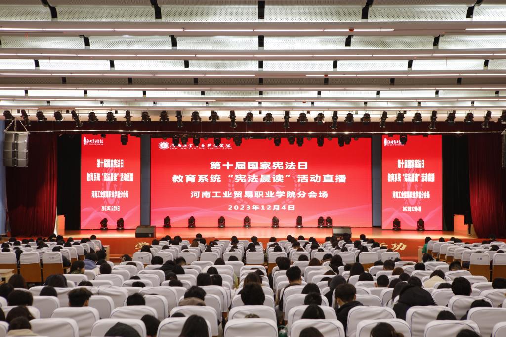 为深入学习贯彻党的二十大精神,贯彻落实习近平法治思想和习近平总书记关于宪法法治教育的重要指示精神,推动全省教育系统学习宣传宪法,弘扬宪法精神,维护宪法权威,根据《河南省教育厅办公室关于开展2023年全省教育系统“宪法宣传周”系列活动的通知》(教办政法〔2023〕425 号)要求,12月4日,我校在龙湖校区学术报告厅组织观看国家教育部主办的第十届国家宪法日教育系统“宪法晨读”活动直播,各二级学院副书记、团总支书记、学生处、团委全体老师和1000余名学生参加。