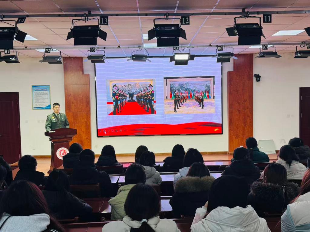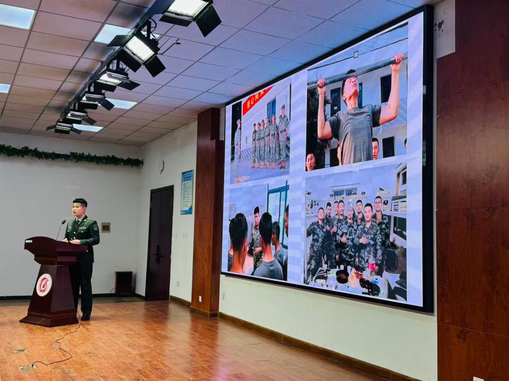 商业贸易学院的徐锟以《坚定入伍选择,牢记初心使命》为主题,分享了自己服役于中国人民解放军中央办公厅警卫局中央警卫团的特殊经历。从地方青年到大国礼兵,他先后圆满完成全国两会执勤、驻华大使递交国书迎宾、上合组织峰会礼兵任务及纪念中国人民抗日战争暨世界反法西斯战争胜利80周年阅兵端门迎宾等重要任务,用“米秒不差、万无一失”的标准诠释了“形象高于生命,责任重于泰山”的信念,让同学们直观感受了大国礼仪风范与军人的责任担当。