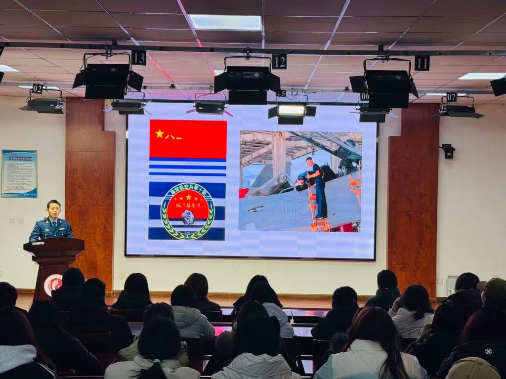 商业贸易学院的姚晓凯围绕《三负责精神——以青春笃行致远》展开分享,作为曾服役于国防部授予“海空雄鹰团”的海军战士,他2019年入伍以来常年执行战备任务,保障战斗起飞百余次、安全飞行千余架次,所在单位三次荣获“集体三等功”。他以“忠诚善战,气霸海空”的宣言,传递了军人的坚毅品格与奉献精神,让同学们对军营战备生活有了更真切的认识。