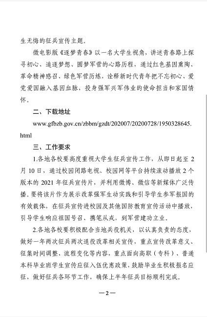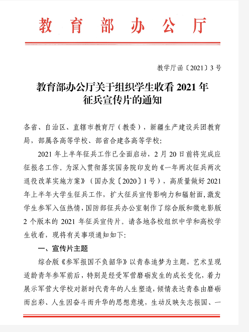 近期,教育部办公厅下发《关于组织学生观看2021年征兵宣传片的通知》(教学厅函[2021]3号),要求各地各校组织学生收看。2021征兵宣传片分为综合版《参军报国不负韶华》和微电影《逐梦青春》2个版本,请各二级学院认真组织学生观看,积极引导学生响应祖国号召、携笔从戎,到军营建功立业。