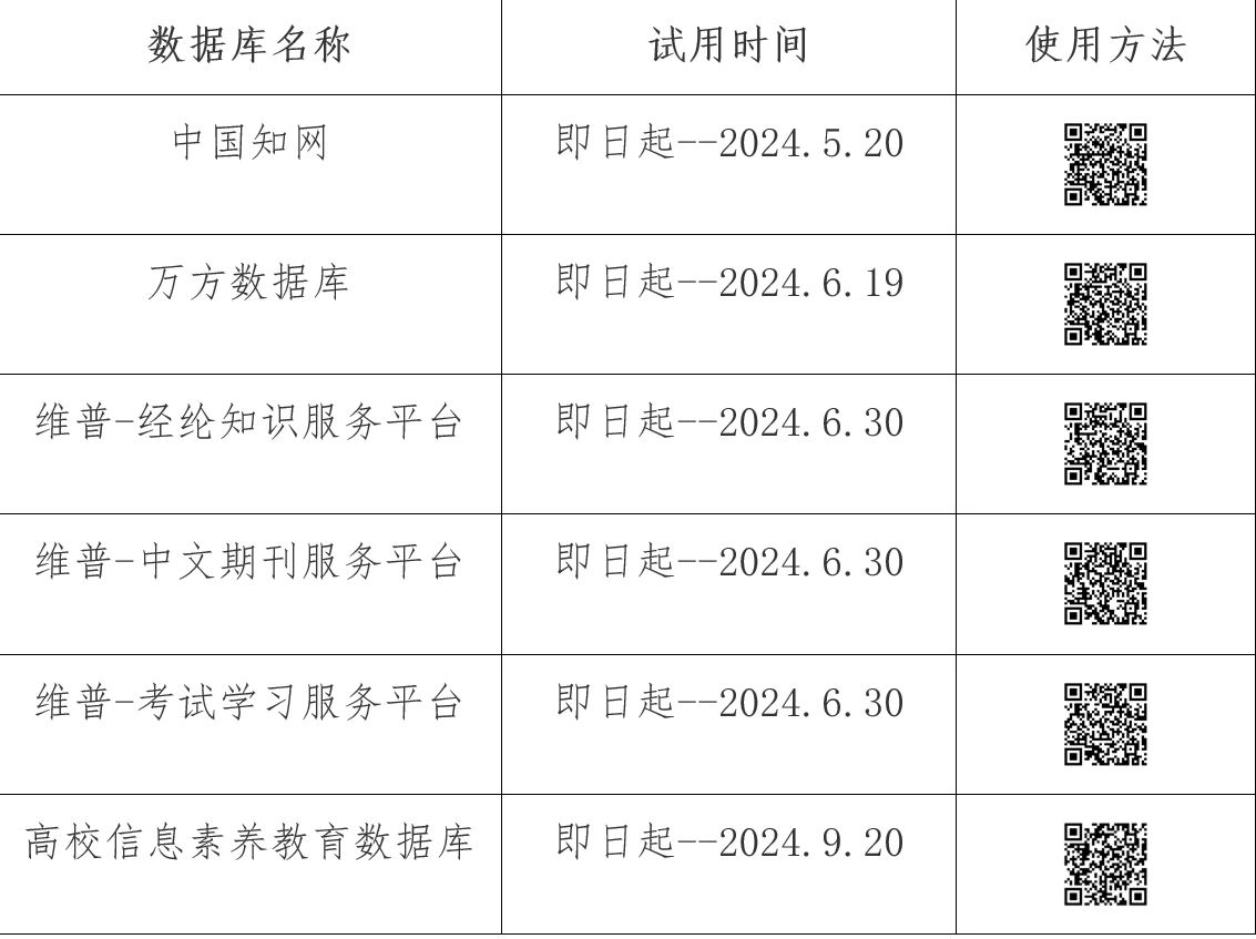 为更好地服务全校师生教学科研、学习提升等需求,加强图书馆文献资源保障能力建设,提高文献信息服务水平,现图书馆携手知网(CNKI)等数据库开通试用服务。