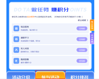活动期间,可点击【参与活动】进入任务栏查看任务,进行【每日签到】【课程学习】【双人对战】【挑战答题】,获取积分。