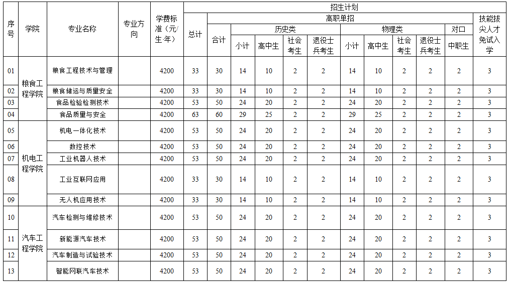 (一)招生专业、分专业招生计划详见《河南工业贸易职业学院2025年单独考试和技能拔尖人才免试入学分专业招生计划表》(附后)。(二)学校2025年单独考试招生计划为1500人,计划招收高中生1172人、中职生66人、社会考生130人、退役士兵考生132人。在总计划的范围内,录取时分类别、分科类、分专业招生计划根据生源具体情况可做相应调整。(三)技能拔尖人才免试入学招生计划99人。(四)录取时,原则上高中生执行对应的历史类、物理类招生计划;社会考生、退役士兵考生各自合并执行对应的历史物理类招生计划;中职生执行对口类招生计划;技能拔尖人才免试考生按照考生类别执行对应的招生计划。(五)学费标准及相关收费1.2025年学费标准按照《河南省发改委、河南省财政厅、河南省教育厅关于调整公办普通高校学费标准的通知》(豫发改〔2020〕456号)和政府收费主管部门有关规定执行,理工类4200元/生·年,文科类3700元/生·年, 详见《河南工业贸易职业学院2025年单独考试和技能拔尖人才免试入学分专业招生计划表》(附后)。2.龙湖校区住宿费600元/生·年,优胜校区住宿费400元/生·年。学校根据办学情况统筹安排学生学习和生活的校区。3.教材费按教学计划规定的课程为学生代购教材,按学年预收教材费400元/生·年 。教材费在学年结束时,按实际发生的费用据实结算,多退少补。(六)学制3年。(七)各招生专业教学培养使用的外语语种为英语。