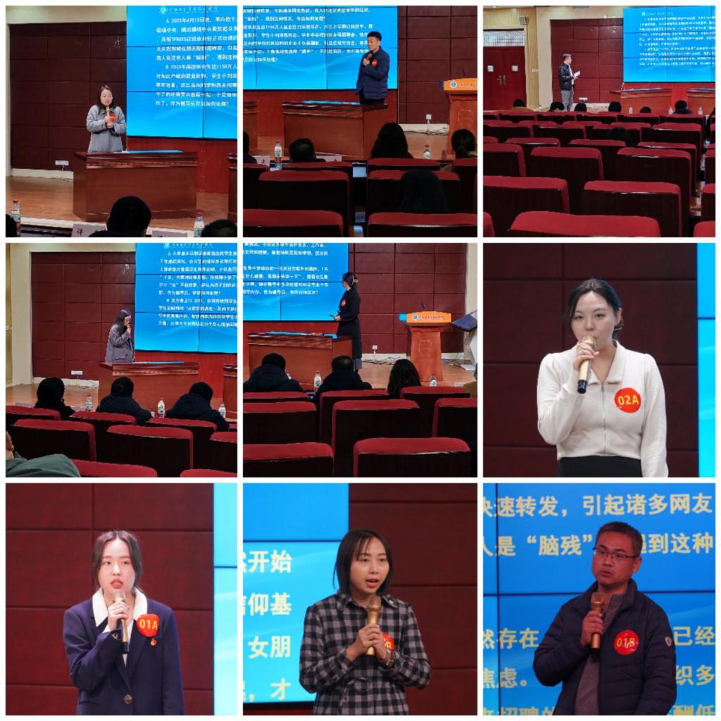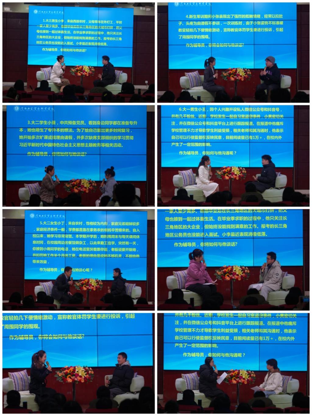 12月5日,我校进行了第三届辅导员素质能力大赛复赛即案例研讨,主要考察辅导员综合运用理论分析问题、研判问题、解决问题、应急处突等能力;比赛采取“AB 角随机组合”,参赛辅导员两人一组,采用同台阐述和问答的形式进行。参赛辅导员紧紧围绕学生工作中的典型案例展开深入细致的研讨分析和理论宣讲,展现出扎实的理论素养、过硬的素质本领和昂扬的精神风貌。29名辅导员披荆斩棘,乘风破浪,经过激烈角逐,共有17名辅导员脱颖而出,进入决赛圈。党委副书记柴瑞帅、专兼职辅导员现场观摩,各二级学院党总支书记或副书记、团总支书记担任评委。