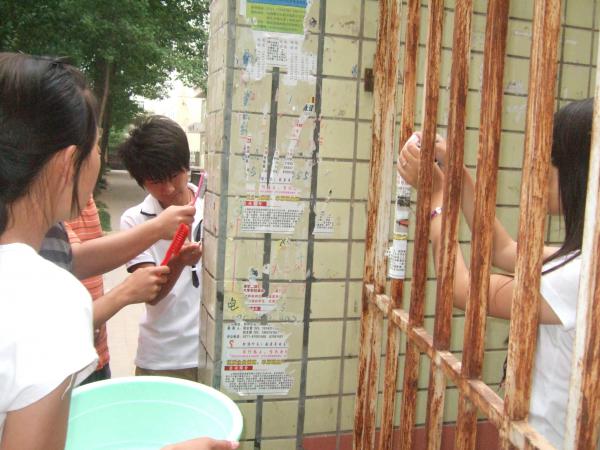此次活动主要是清理校园的垃圾广告,美化校园及周边环境。同学们一早集合,并携带着事先准备好的清理工具,有铲子、垃圾袋、抹布等,可谓一应俱全。同学们为了节省时间,分组分区进行垃圾广告的清理,尽管清理垃圾广告很费力,但同学们仍然热情饱满、干劲十足,遇到贴的比较牢固的野广告,同学们就齐心协力共同处理。同学们或准备有关工具,或帮忙为其它同学提水,或认真的擦洗窗户,或用刀具把纸屑清理干净,或直接挽起袖子用抹布蘸水来擦,每个人都非常细心。当看到那些焕然一新的墙壁时,大家都露出了开心的笑容。