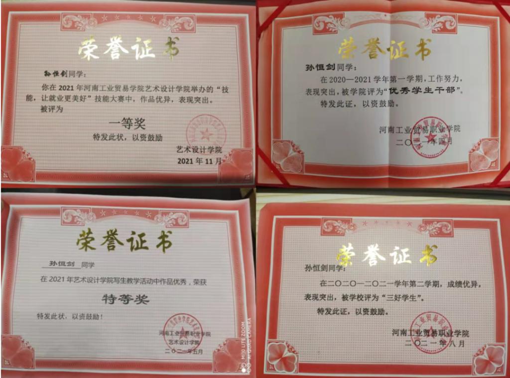 ◆2021年荣获河南工业贸易职业学院2020-2021学年第二学期“优秀学生干部”称号;