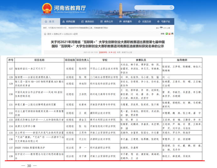 ◆2021年荣获第七届中国国际“互联网+”大学生创新创业大赛职教赛道河南赛区选拔赛三等奖;