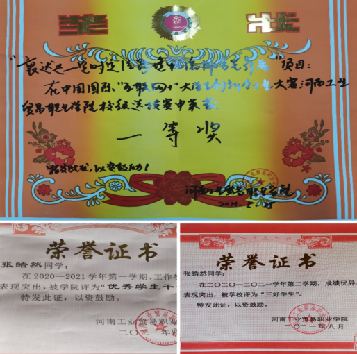 ◆ 2021年荣获河南工业贸易职业学院“三好学生”;