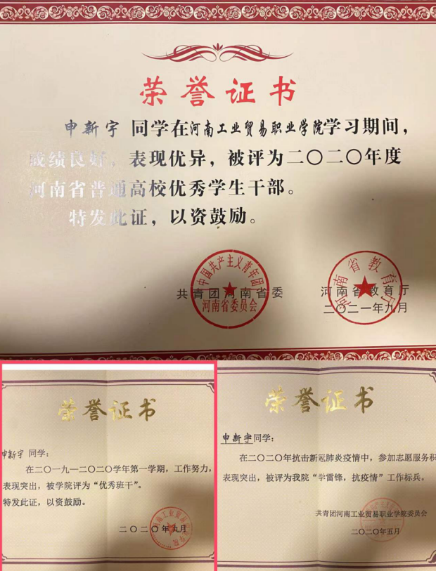◆ 2020年度获得“河南省普通高校优秀学生干部”。