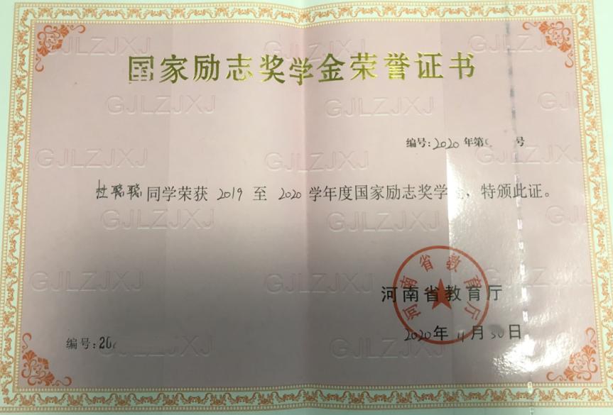 ◆ 2020年荣获国家励志奖学金