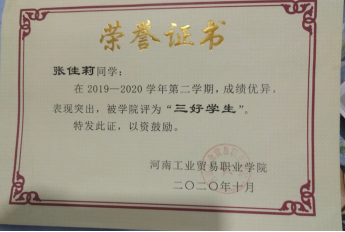 ◆ 2019-2020学年中,获得河南工业贸易职业学院“三好学生”荣誉称号