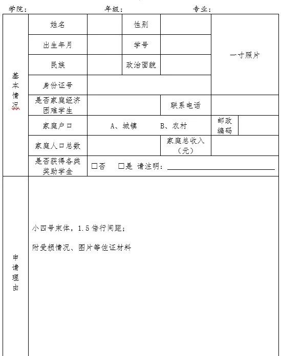 1.符合资助条件的学生填写《河南工业贸易职业学院学生临时困难补助申请表》(见附件1),并提供家庭所在地相关部门(村、镇、社区街道办)出具的受损情况证明等作为佐证材料,证明中须体现学生姓名、受损情况(附图片)等,未注明受损情况的不予资助;