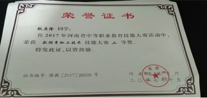 2017年获得河南省中等职业教育技能大赛二等奖。