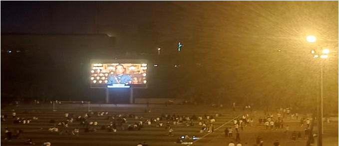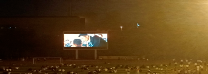 为了丰富在校学生的课余生活,增强同学们之间的友谊,应用外语学院共八个班级近454名同学于2022年4月20日晚上七点在操场参加了学校举行的“观影活动”。当晚观看的影片是《建军大业》。