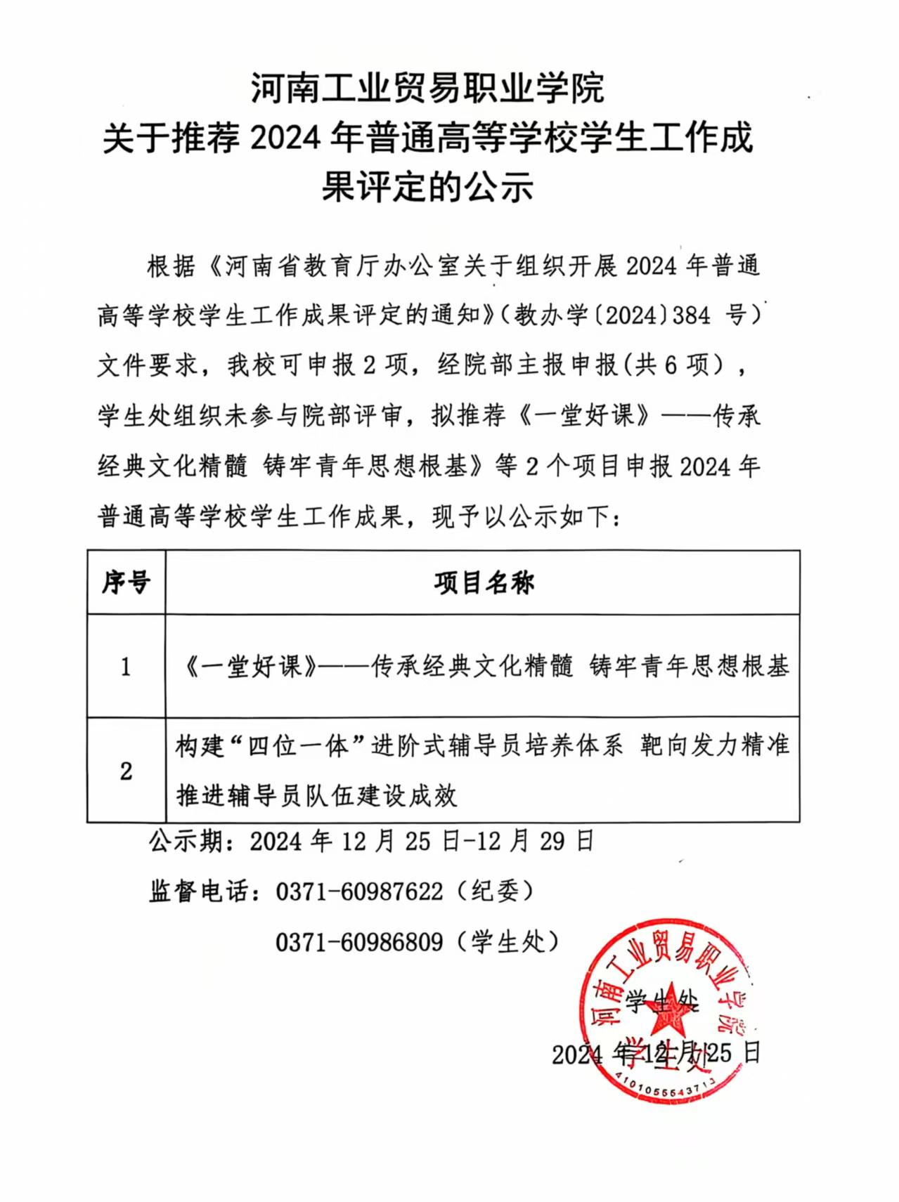 关于推荐 2024 年普通高等学校学生工作成果评定的公示