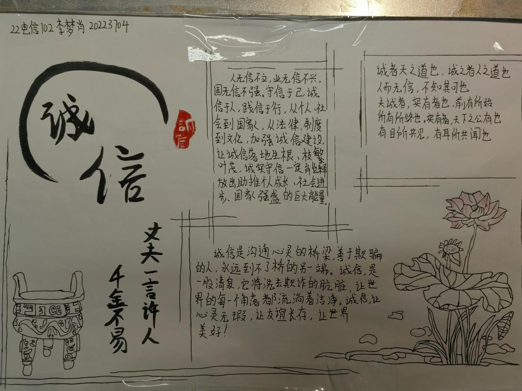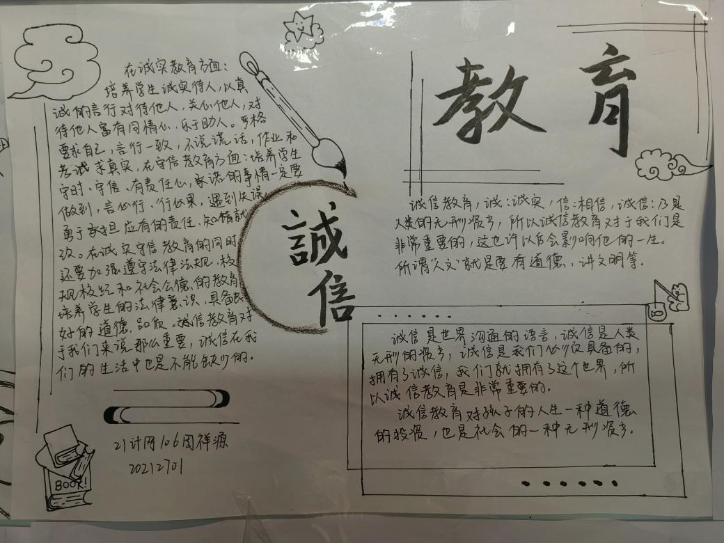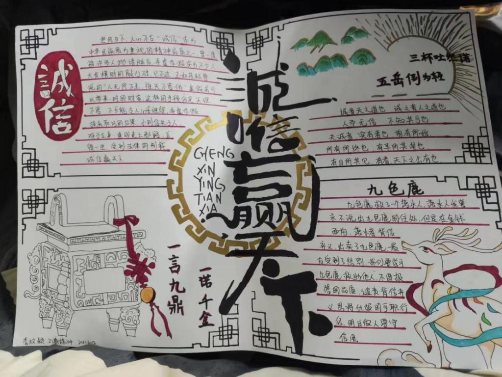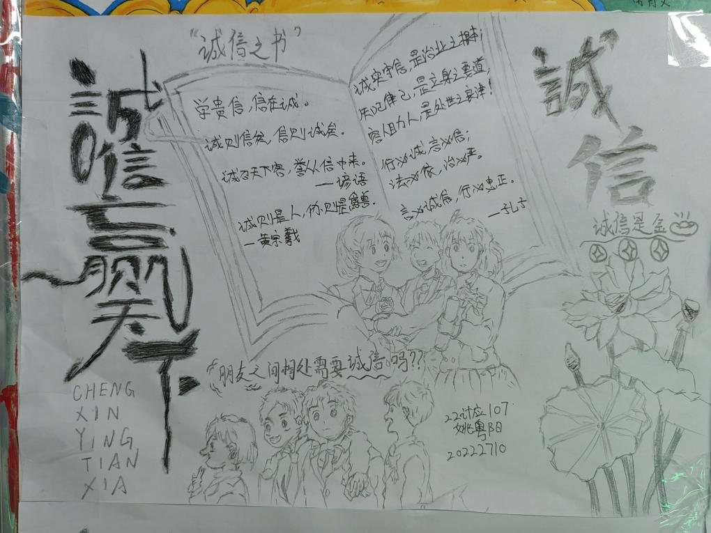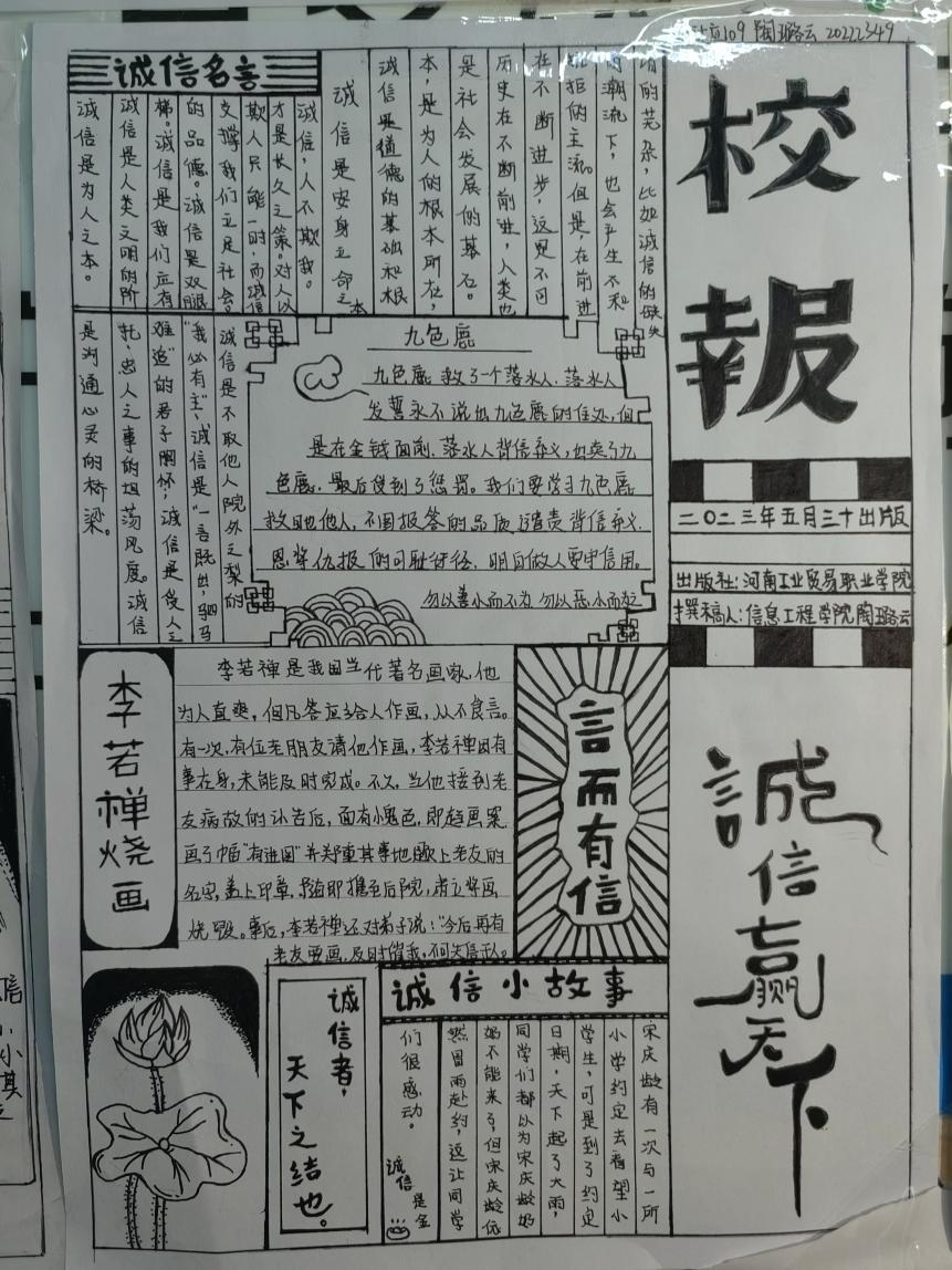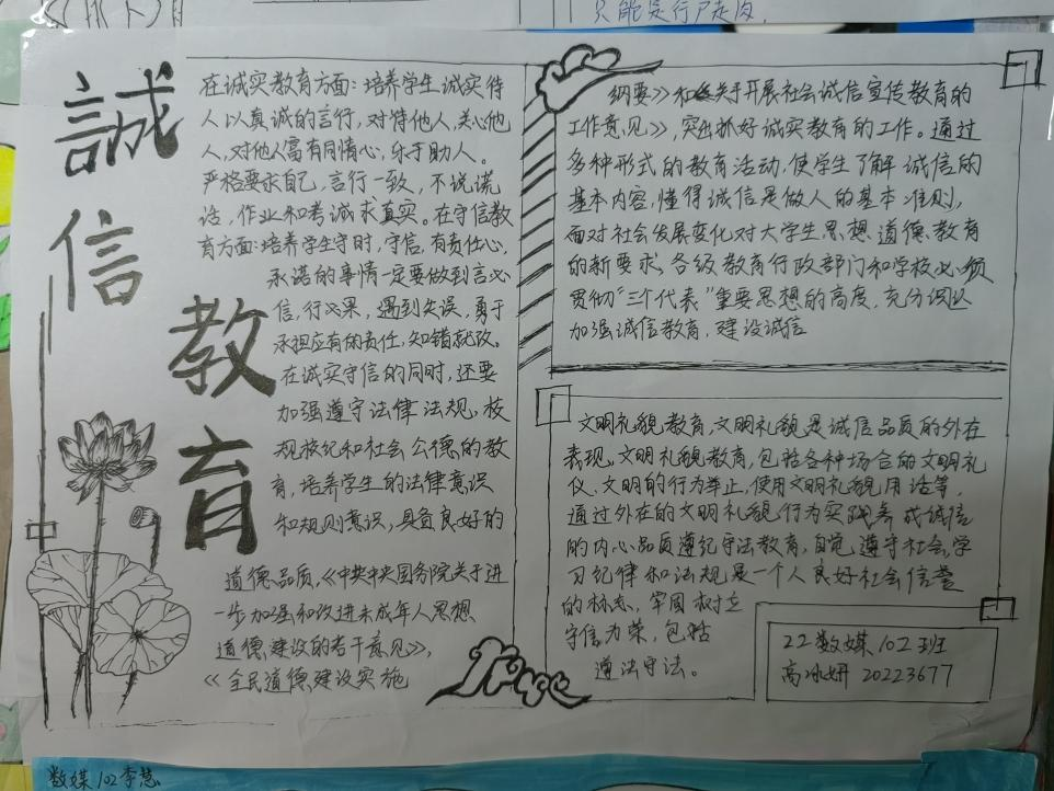 诚信是中华民族的传统美德,也是社会主义核心价值观的重要内容,更是当代大学生塑造健康人格,实现人生价值的道德基石。为不断塑造大学生的诚信品质,进一步推进大学生思想政治教育工作,促进资助政策的充分宣传和有效落实,2023年5月29日-31日,我院认真落实学校关于资助诚信教育主题活动的文件精神,结合大学生核心素质培养和实际工作,在全院范围内开展了“绘制诚信教育主题手抄报”的诚信教育活动。活动期间,同学们踊跃报名,积极参加,形成了良好的宣传教育氛围。为表扬先进,树立榜样,现对我院成果优秀的十位同学进行表彰,以下为结果公示: