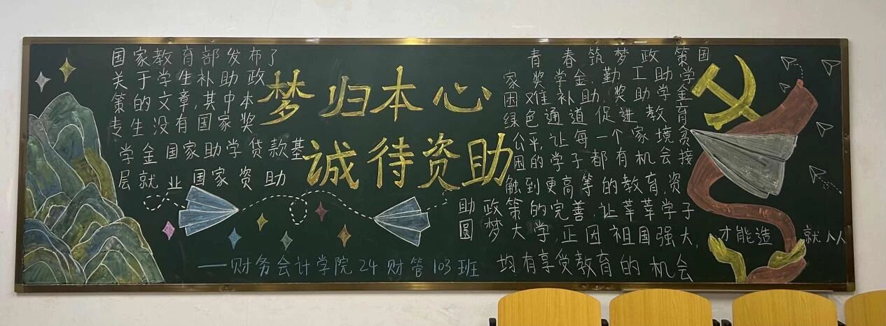 各班级的黑板报以“资助育人 筑梦未来”为主题,重点突出了资助政策的主要内容以及申请须知,语言简洁明了,展现了同学们对国家资助政策的支持与理解。黑板报不仅传递了政策信息,还以激励性的语句鼓励同学们努力学习、感恩社会。