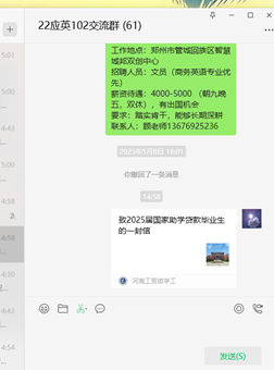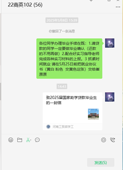 我院辅导员向国家助学贷款毕业生转发《致2025届国家助学贷款毕业生的一封信》,希望毕业生们携手将爱心接力,将信誉传承,书写良好的个人信用记录,用实际行动回报党和国家。