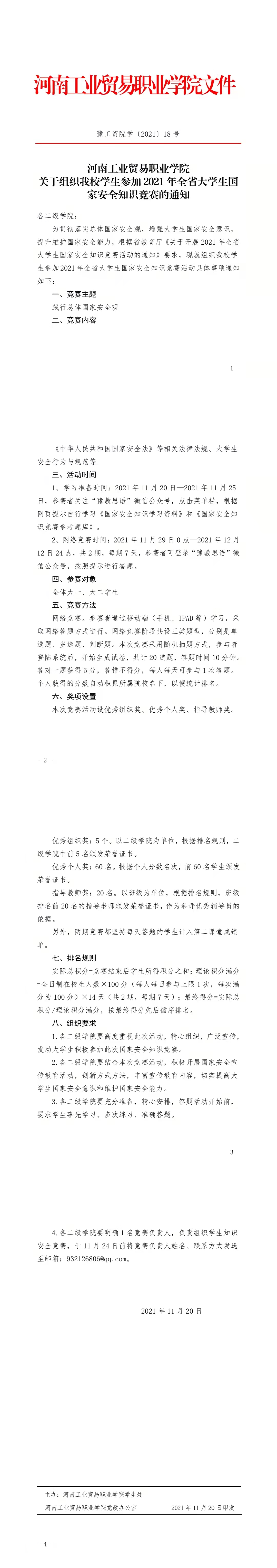 河南工业贸易职业学院关于组织我校学生参加2021年全省大学生国家安全知识竞赛的通知