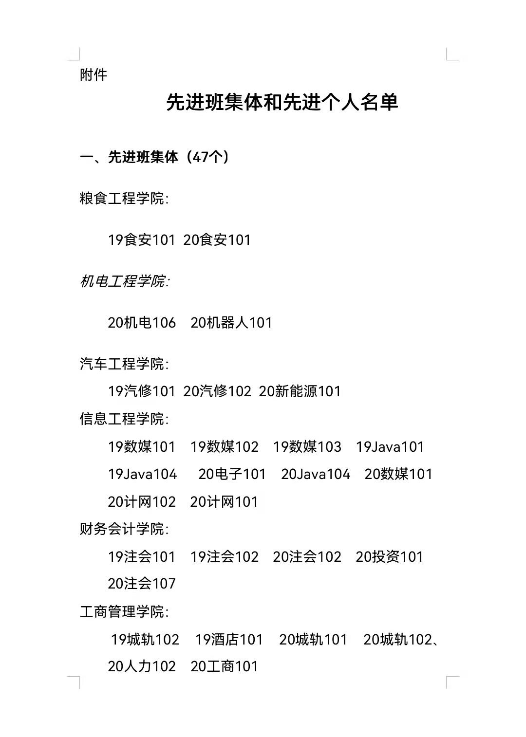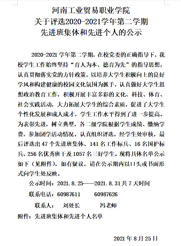 河南工业贸易职业学院关于评选2020-2021学年第二学期先进班集体和先进个人的公示