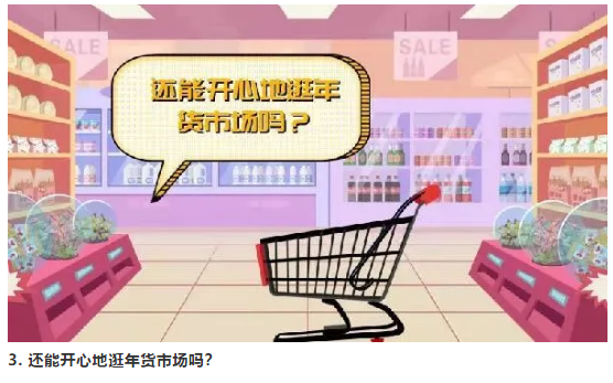 尽量少去人群容易聚集场所,需要逛年货市场的需全程正确佩戴医用外科口罩,注意保持1米社交距离,尽量不扎堆、不聚集。