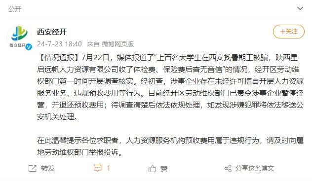 西安经济技术开发区管理委员会官方微博23日发布消息称,7月22日,媒体报道了“上百名大学生在西安找暑期工被骗,陕西星启远帆人力资源有限公司收了体检费、保险费后杳无音信”的情况,经开区劳动维权部门第一时间开展调查核实。经初查,涉事企业存在未经许可擅自开展人力资源服务业务、违规预收费用等行为。目前经开区劳动维权部门已责令涉事企业暂停经营,并退还预收费用;待调查清楚后依法依规处理,如发现涉嫌犯罪将依法移送公安机关处理。